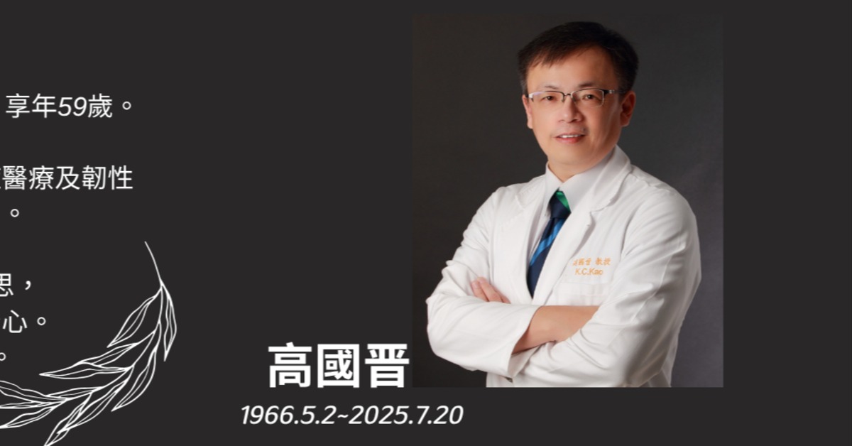 「中華民國重症醫學會」20日發布公告,學會理事長、林口長庚醫院「胸腔內科系呼吸道疾病科」教授級主治醫師高國晉離世,享年59歲。