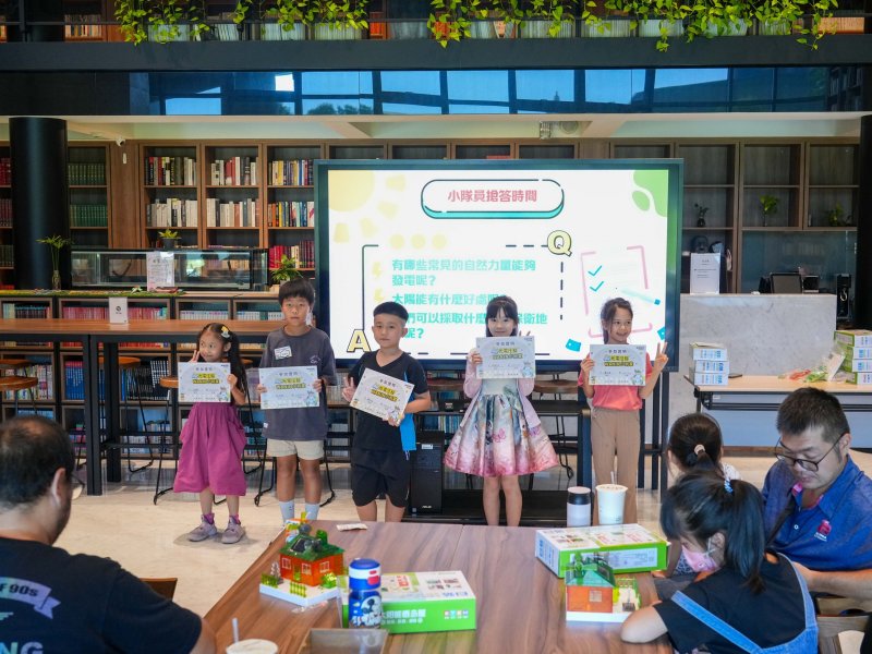 活動不僅是手作與遊戲,更帶來了臨場感十足的體驗。孩子們在操作太陽能小屋時,認識了光能轉化的原理;同時了解到,「拾本書堂」所在的網銀國際大里軟體園區技術中心頂樓,設置了185片太陽能板,正穩定支援大樓供電並減少碳排放,自2023年啟用以來,這些太陽能板已累計發電149,561度,相當於減少74,033公斤二氧化碳排放。為了幫助孩子理解抽象數據,現場簡單以「約相當於90棵樹一生的吸碳量」作為比喻,孩子們瞪大眼睛說:「那屋頂是不是像種了一片小森林!」這樣的方式讓永續概念更貼近日常,也展現網銀國際對減碳的長期承諾,實際呼應「SDG 7:可負擔的潔淨能源」與「SDG 13:氣候行動」。