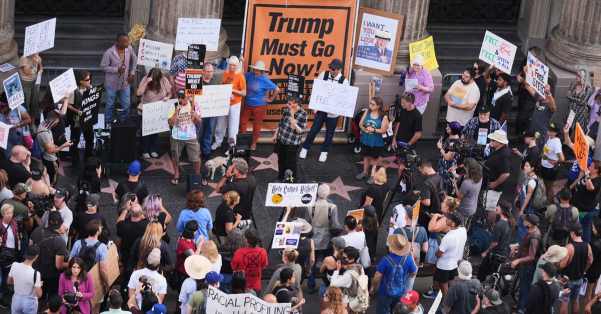 美國紐約時報廣場的迪士尼商店人潮越聚越多,示威者高舉標語,力挺言論自由,聲援被迪士尼旗下美國廣播公司停播的老牌談話節目吉米夜現場。示威者:「這是政府過度干預和噤聲,如果吉米金摩因為那番溫和的評論就遭到審查遭到噤聲,那我們沒有一個人是安全的。」