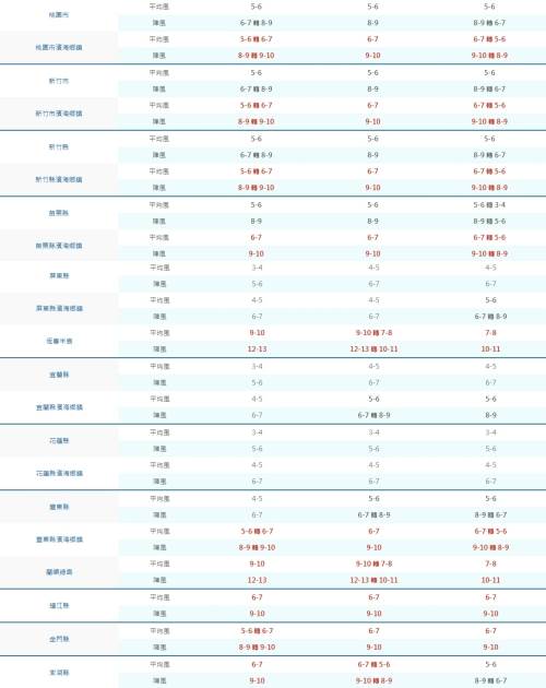 氣象署資料指出,桃園市濱海鄉鎮、新竹市濱海鄉鎮、新竹縣濱海鄉鎮、苗栗縣濱海鄉鎮、恆春半島、台東縣濱海鄉鎮及蘭嶼和綠島、連江縣、金門縣、澎湖縣,截至明晨06時平均風力、陣風等級達到停班課標準。