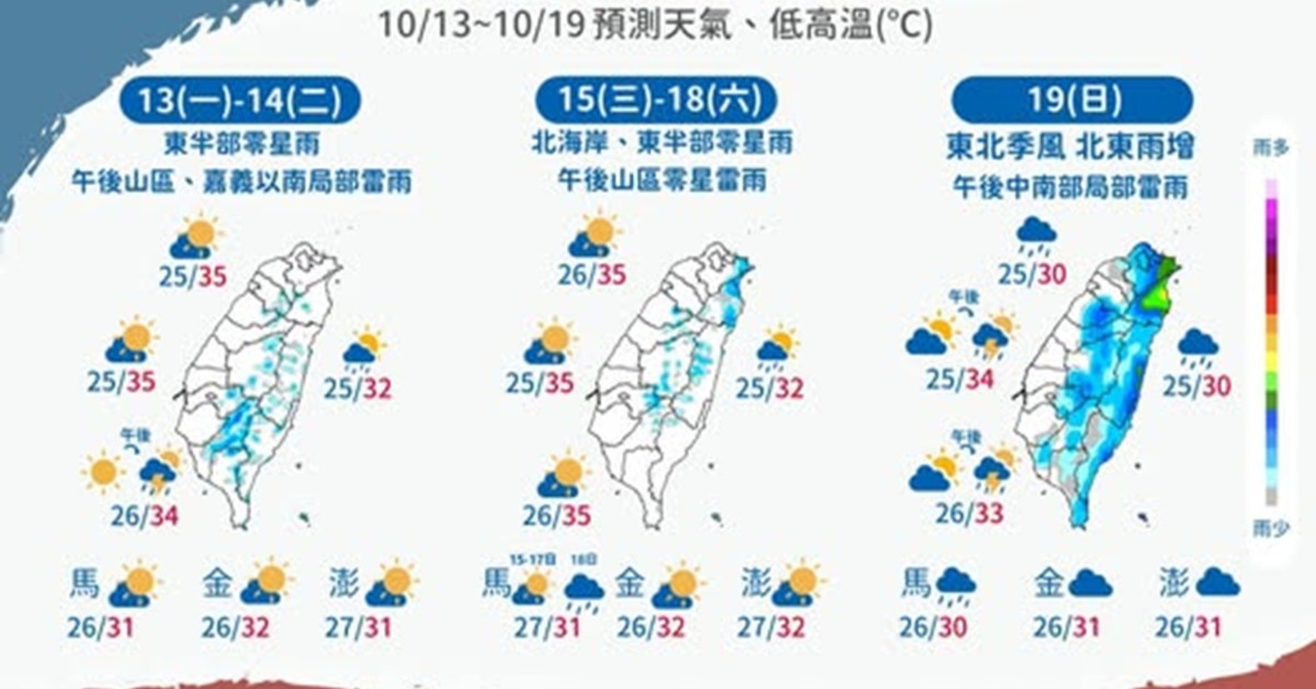 中央氣象署提到,到了周日(19日),東北季風明顯增強,迎風面降雨明顯增加,高溫將下降,水氣增多,北部及東半部地區容易出現短暫陣雨,午後中南部地區仍有局部雷陣雨。高溫方面,桃園以北、宜蘭及馬祖約28至30度,花東約30至31度,其他地區約32至34度。提醒民眾做好降雨與溫度變化的應對措施,適時增減衣物並攜帶雨具。