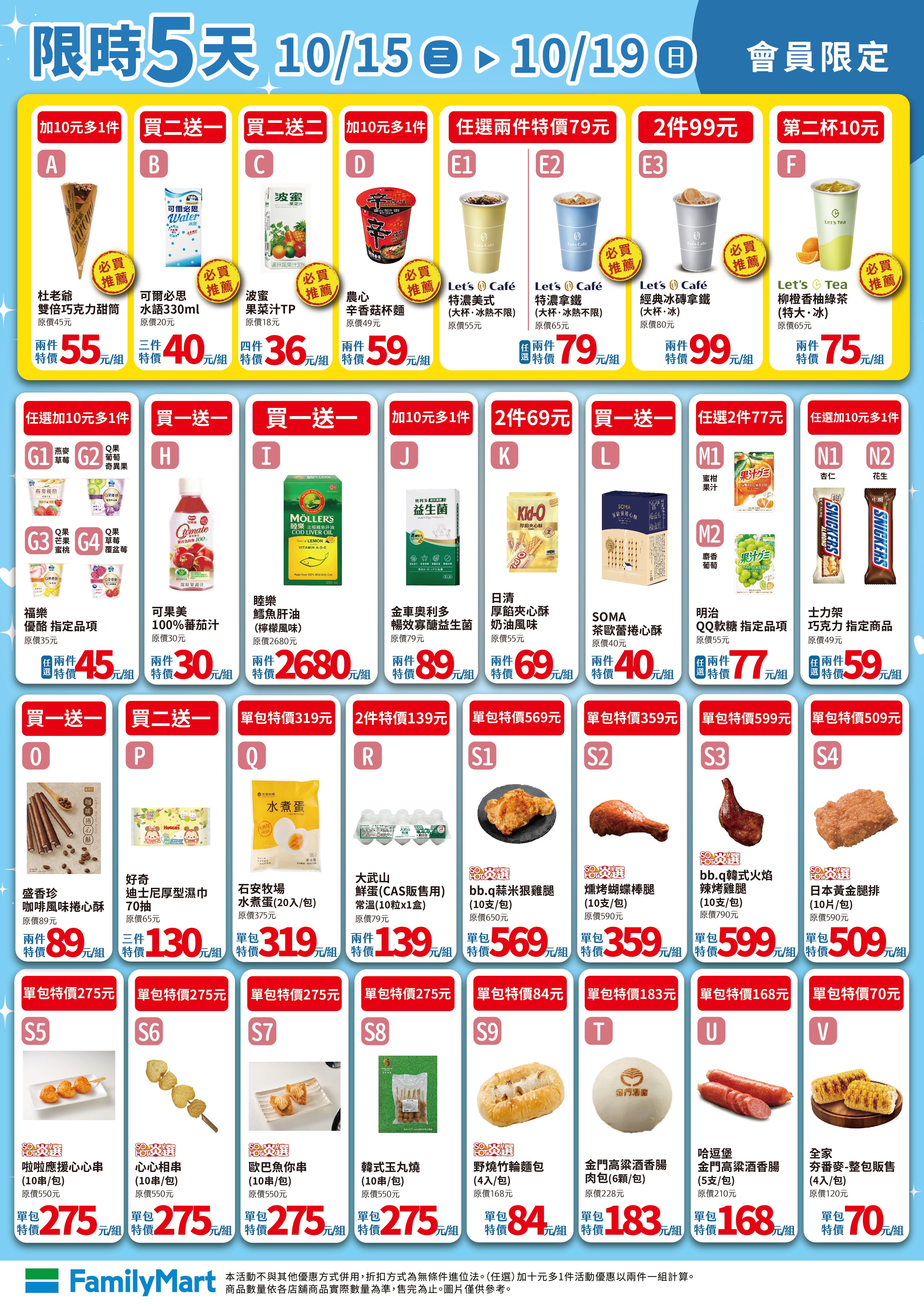 全家於10月15日起至10月19日推出「會員限定」限時優惠,其中可果美100%番茄汁、SOMA茶歐蕾捲心酥、盛香珍咖啡捲心酥、保健品如睦樂鱈魚肝油皆享「買1送1」。