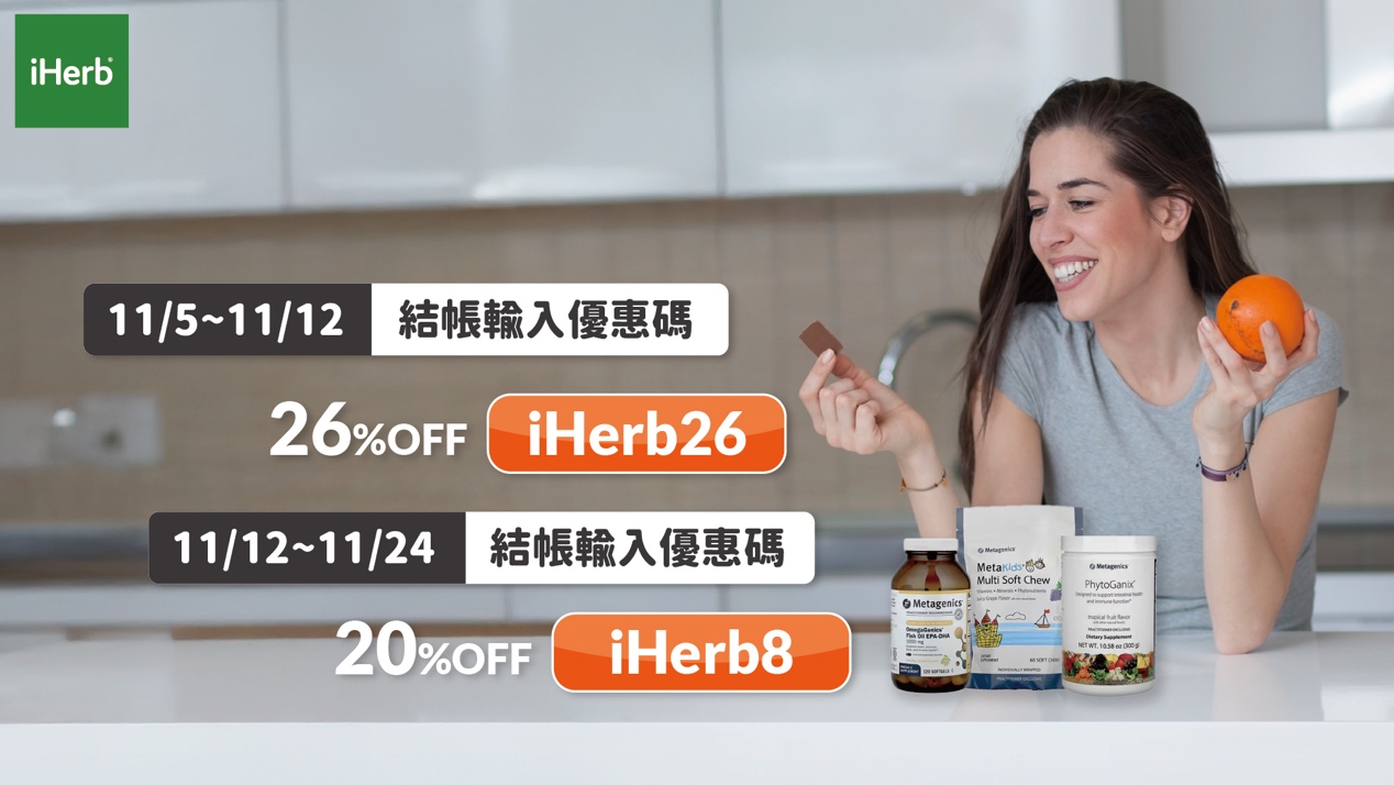 iHerb雙11購物節開跑!首波優惠碼下殺74折,輕鬆入手專業級保健品牌Metagenics,一站式購足全家營養!