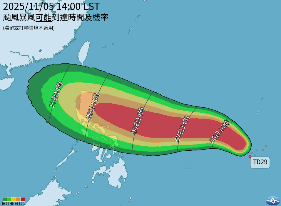 另外,氣象署預報員黃恩鴻也提到,熱帶性低氣壓TD29目前結構仍在整合中,預估最快今日就可能發展成輕度颱風,並以西北西方向移動,未來幾天將逐步增強。根據路徑推測,下週一通過菲律賓北側後,路徑將明顯北轉,朝台灣方向接近。若提早北轉,颱風將從台灣東側外海北上;若延後北轉,可能進入台灣海峽南端,甚至登陸西南部陸地;若北轉角度偏西,路徑則有機會靠近中國廣東沿岸。無論哪一種路徑,下週一起台灣就會受到颱風外圍雲系影響,降雨逐漸增多,下週二、三為影響最明顯的時段,北部與東半部將出現明顯雨勢。若颱風進一步靠近,南部地區也可能接近暴風圈範圍,風雨將顯著增強。目前各國模式對路徑仍有差異,變數相當大,需持續觀察。