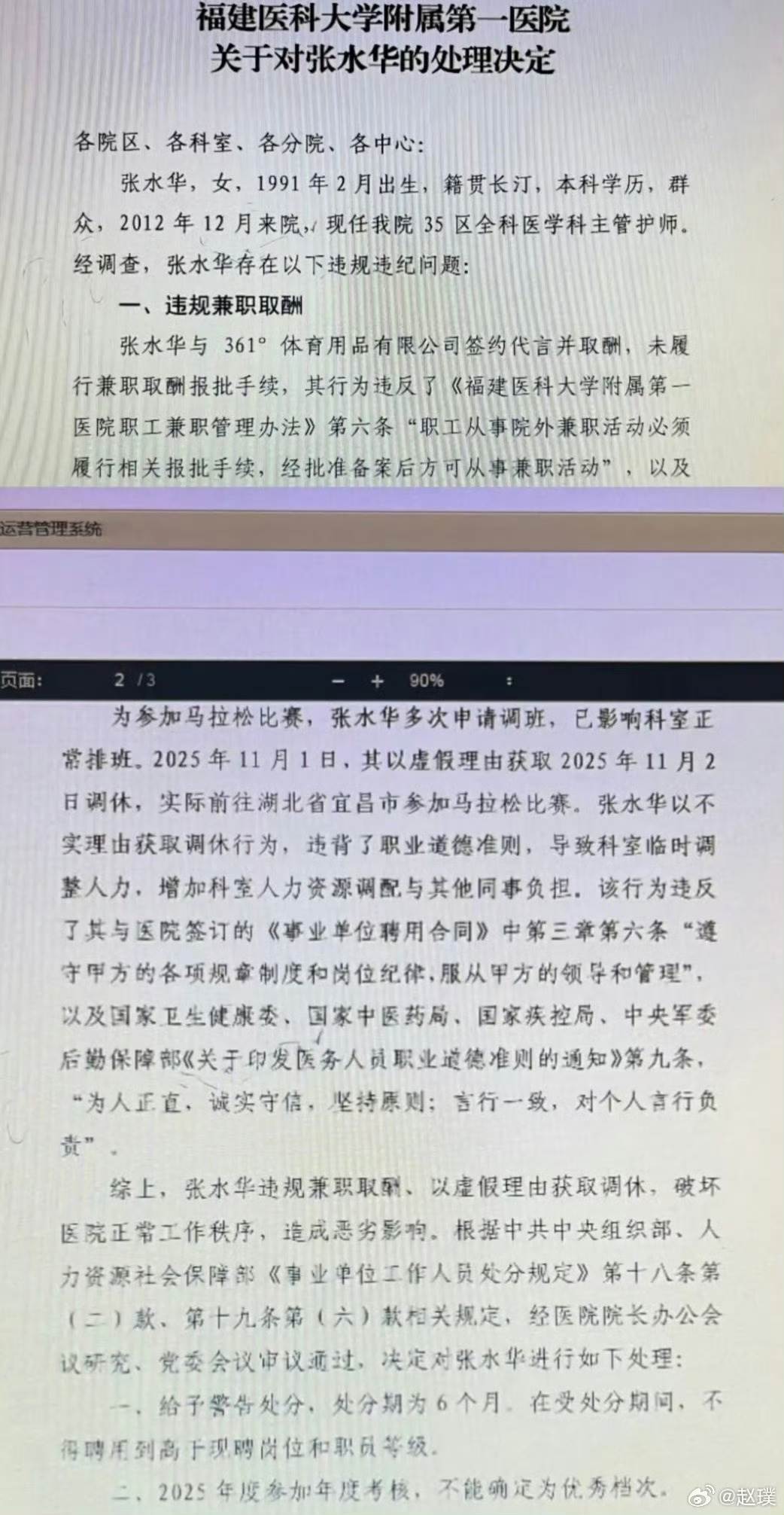 張水華遭福建醫科大附一院重懲,警告6個月並取消2025評優。(圖/翻攝自微博@趙璞)